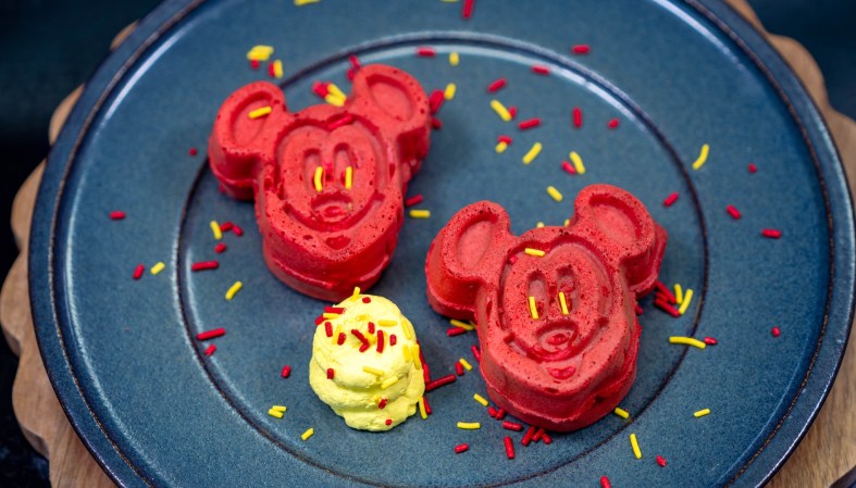Two red waffles in the shape of Mickey Mouse