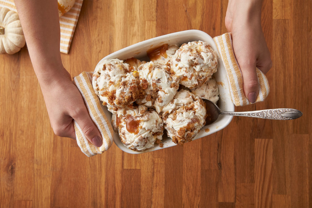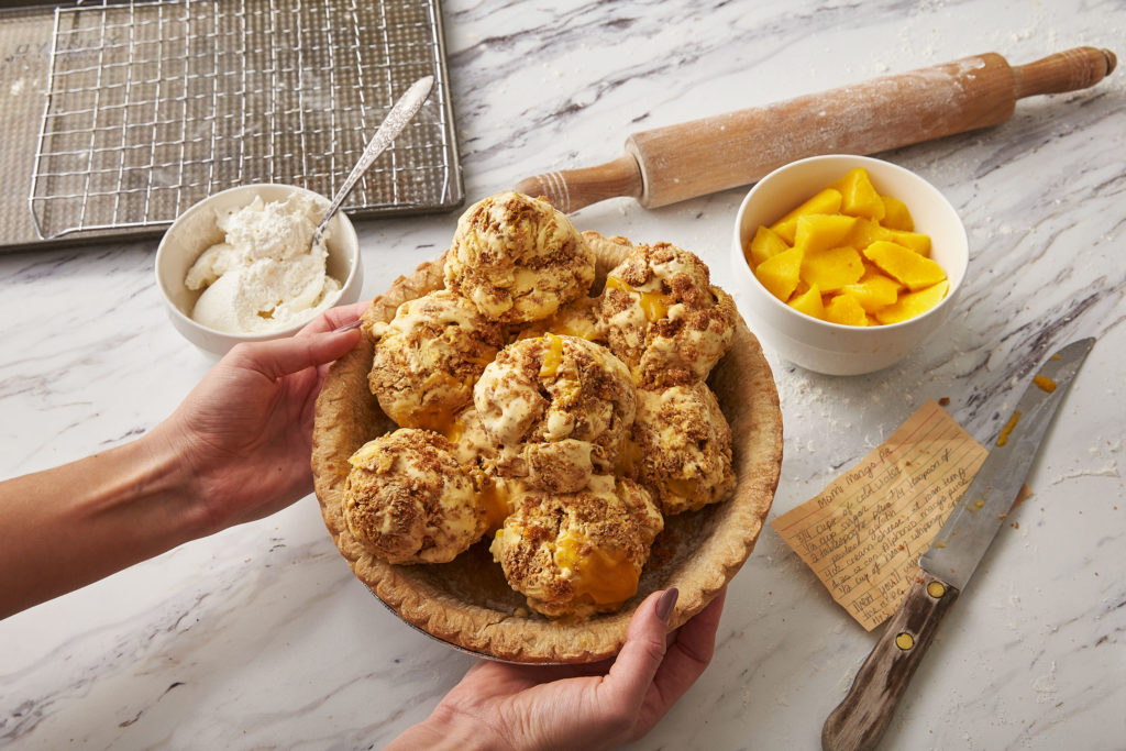 “Realizing [Hrishikesh Hirway’s mom’s] secret recipe translated perfectly to ice cream, we didn’t change much. Mango pureé blended with tangy cream cheese and fluffy whipped cream creates a silky sweet curd reminiscent of her pie filling. Crumbles of salty graham cracker crust are layered throughout a rich, caramelized ice cream for a cultural mash-up that’ll be the standout star of your next Thanksgiving spread.”