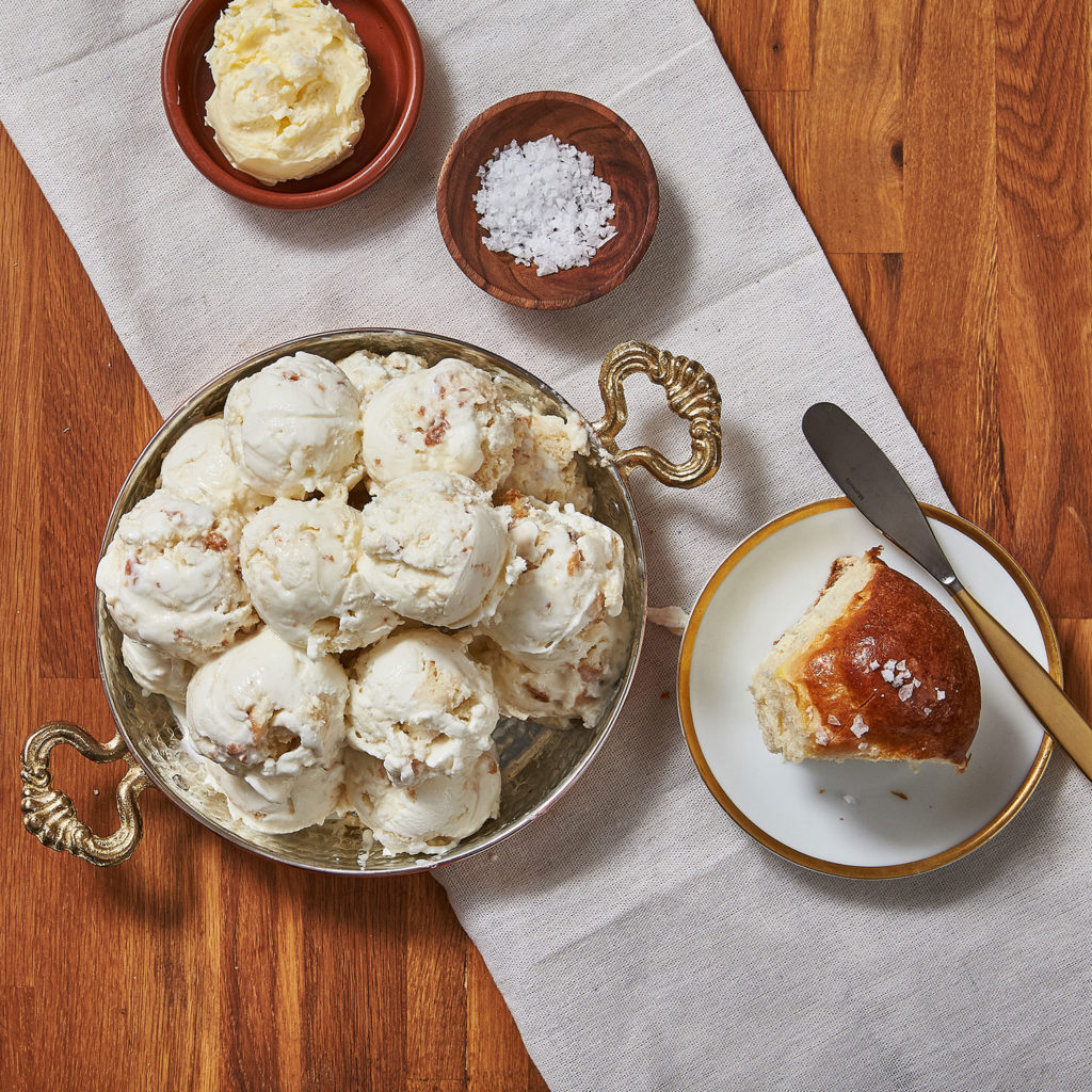 “What’s a holiday feast without warm, fluffy rolls? We carb-load by gently folding buttered rolls topped with flaky sea salt into a salted butter ice cream to double down on the savory, making this simple side the most coveted. It’s rich, it’s decadent, and it’s as classic as it gets.”