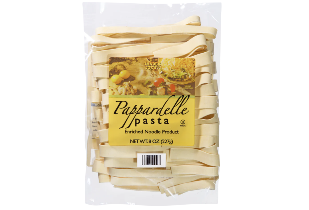 Trader Joe’s Pappardelle Pasta are wide noodles made with durum semolina flour and eggs. The pasta is made by hand in small batches and dried slowly at low temperatures—the resulting noodles really hold on to sauce.