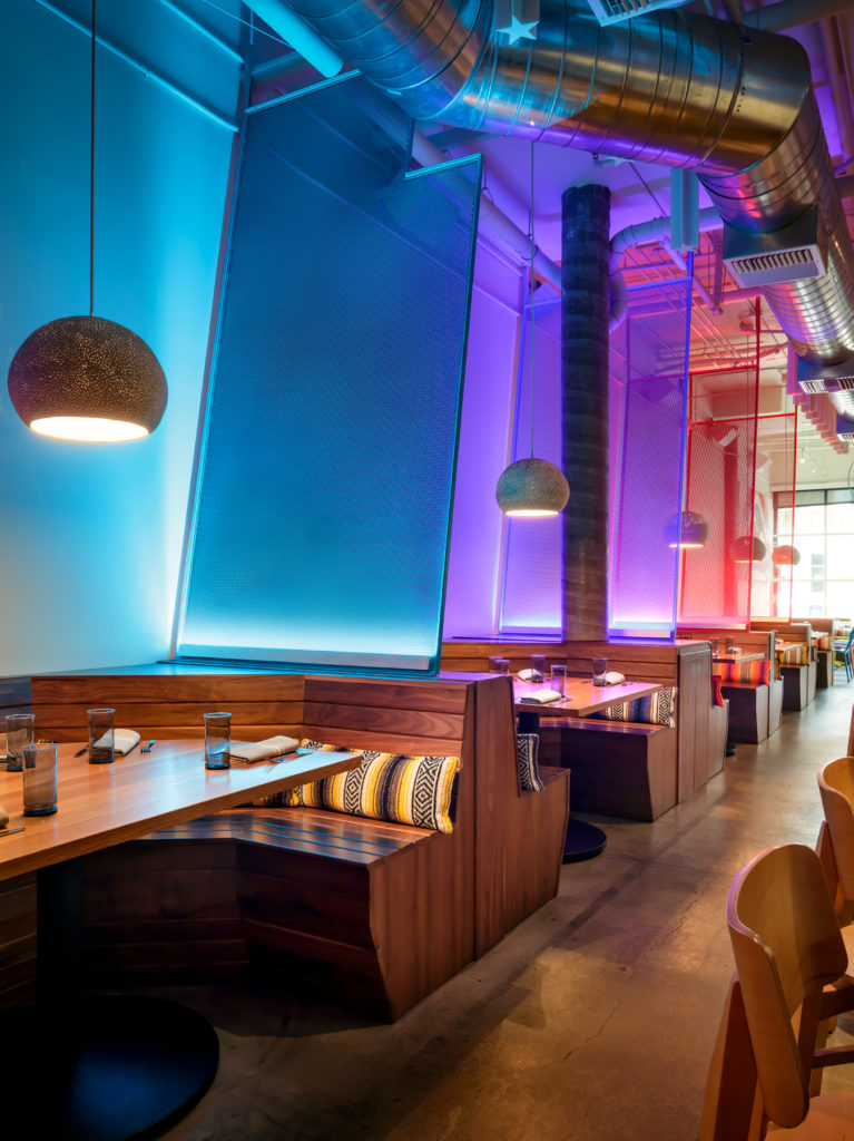 “For a restaurant that has ample room and can space everyone out, the opportunity is to create warmth and connection within the originating intention of the brand. This can be accomplished by marking tables as points in space, whereby each table is a star in the realm of the restaurant universe. That could look like hanging art over each table, or pools of colored light, anything to specialize the dining experience at the table. These moves should reflect the idea of the place.”