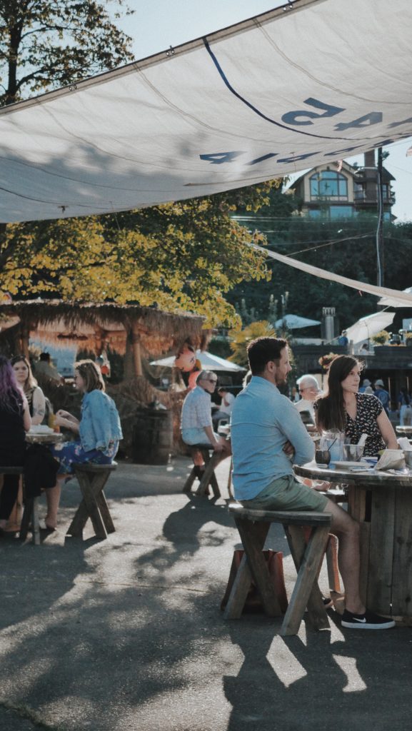 “We got a 40-foot main sail from a sailboat that we’re using for shade. We’ve made it warm and inviting. We trucked in sand. At the entrance we have a lifeguard station and keep it goofy while keeping people safe. They check your temperature under an umbrella and tell you there’s no running around the pool and you need to keep your mask on when you leave your table. People are into it and in they’re happy to wear a mask! I’ve heard so many people say they’re here because of our intentionality in making it work.”