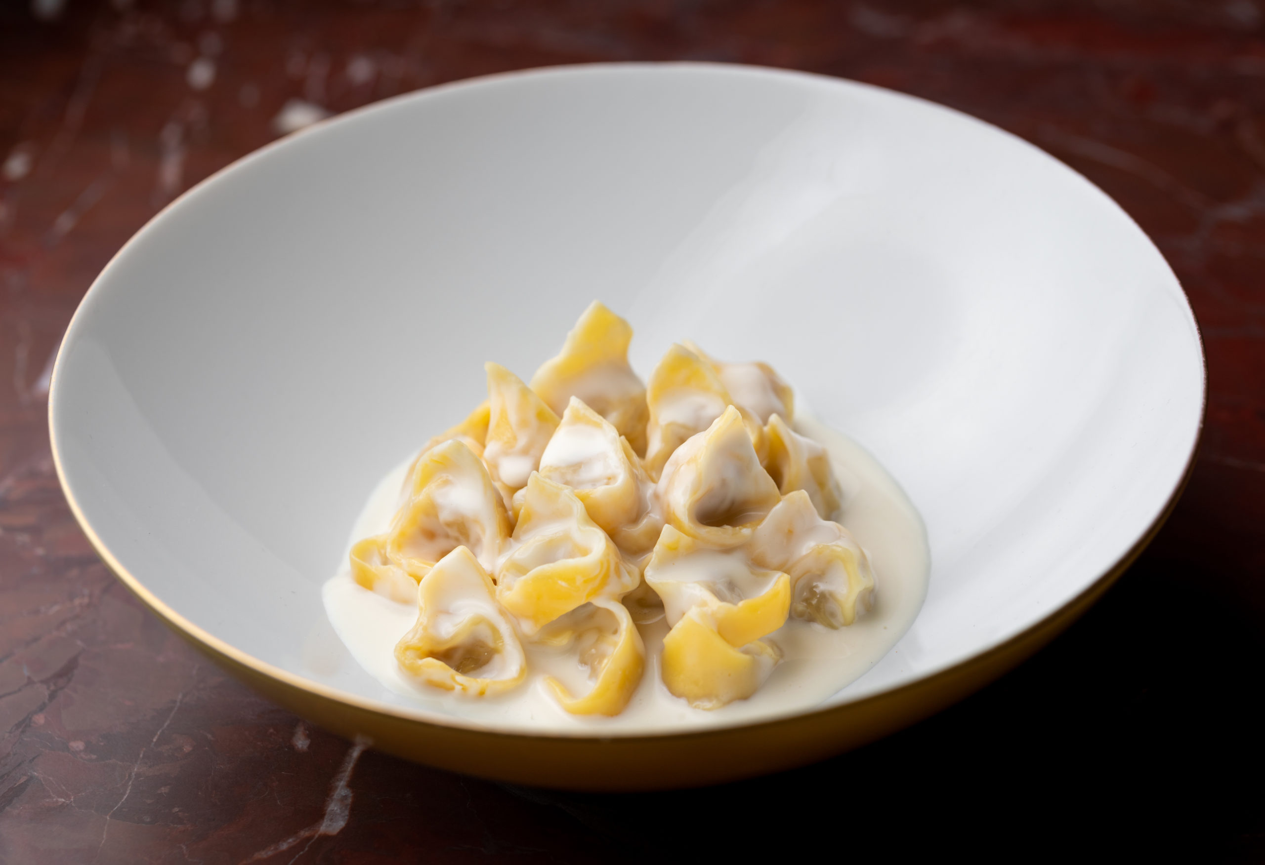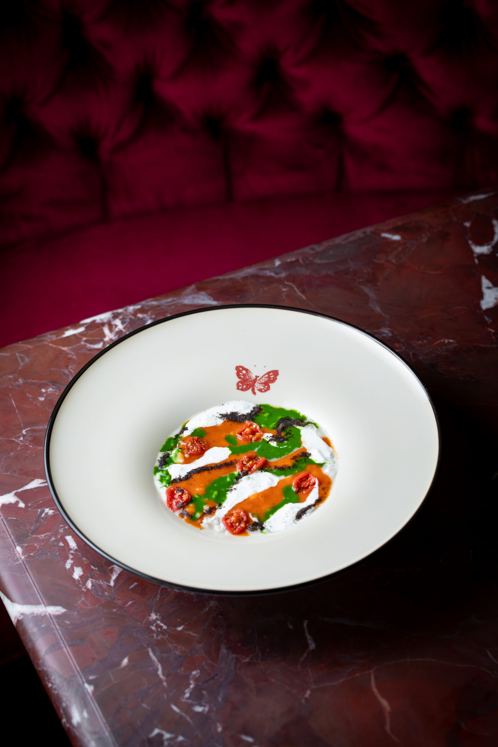 As one might expect, the interior is designed with Italian fashion in mind, using Gucci Décor wallpaper, red marble-topped tables, and cherry red velvet banquettes. There’s no doubt that it will become a social hub for Bottura’s wide-ranging circle of famous friends, both culinary and in the entertainment business.
