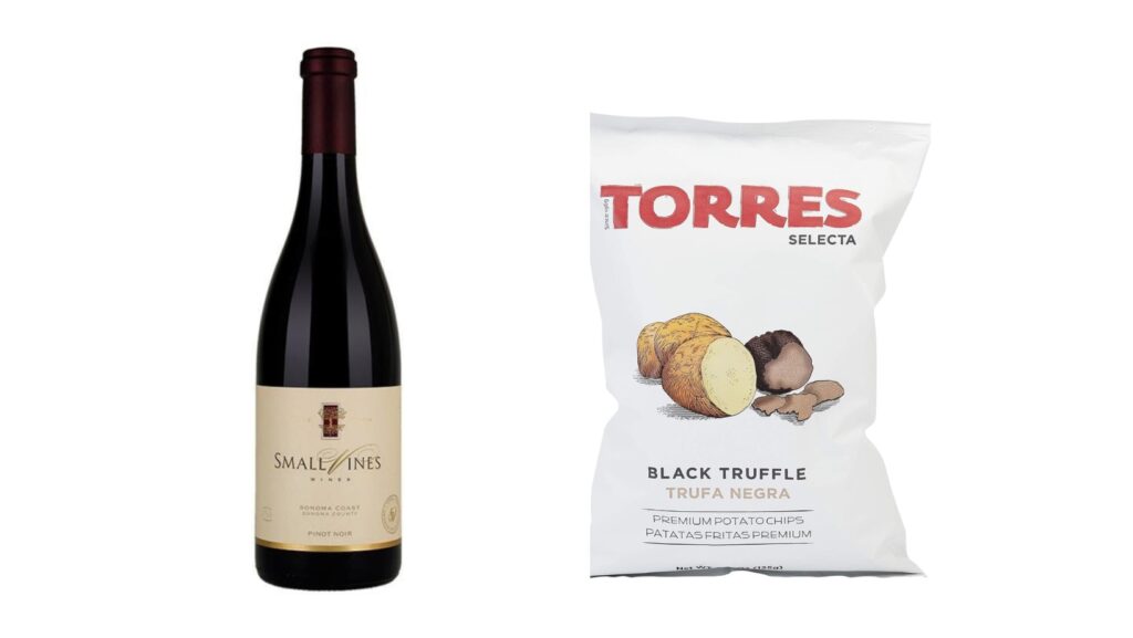 The aforementioned idea of pairing like with like is strong here, with the earthiness and umami factor of Small Vines’ Pinot Noir matching up perfectly with the true truffle flavor of Torres chips. Both Sloan and I agree that the Torres chips are the most authentic-tasting truffle chips on the market, free of the fake truffle-oil taste that you find in a lot of truffle-flavored items. “The Torres, I think, are a little more pure to the flavor and just a touch more subtle, and natural tasting. I’ll say more true to the truffle-like mushroom flavors that you would get shaved on a dish at a restaurant,” he says. “It’s a really, really good Pinot Noir combination.”