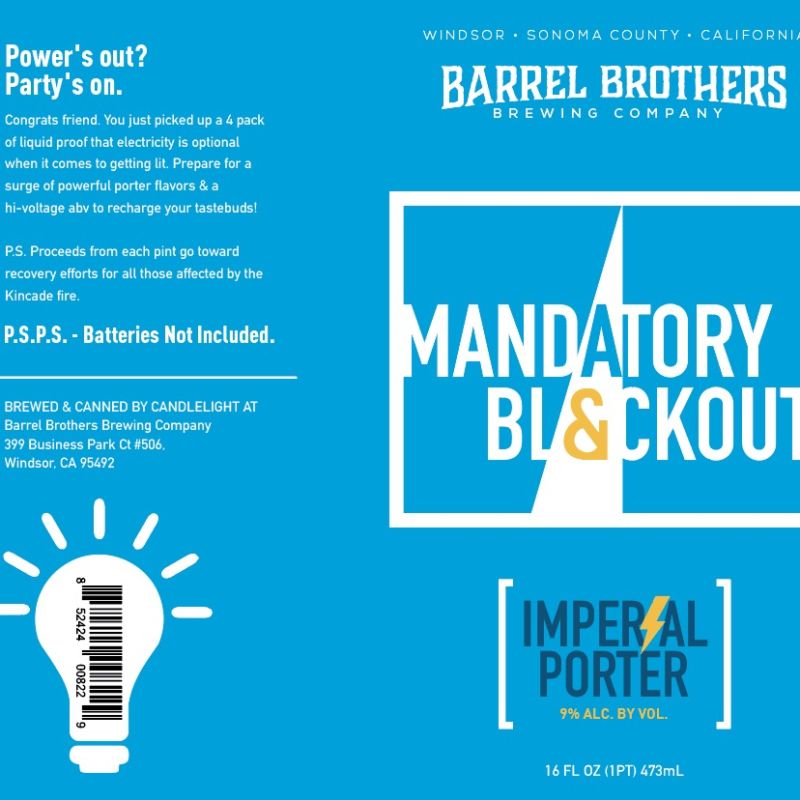 Sonoma was hit hard by the Tubbs Fire in 2017, and the economic effects are still being felt on the tourism industry, so breweries may have just cause to feel concerned about the blackouts. Sonoma saw the wildfire season start early this year with the Sand Fire on June 8 and crescendoing with the Kincade Fire on October 23. Preventive blackouts were mandated by PG&E in October and November, inspiring the Barrel Brothers’ beer name: “Mandatory Blackout.”