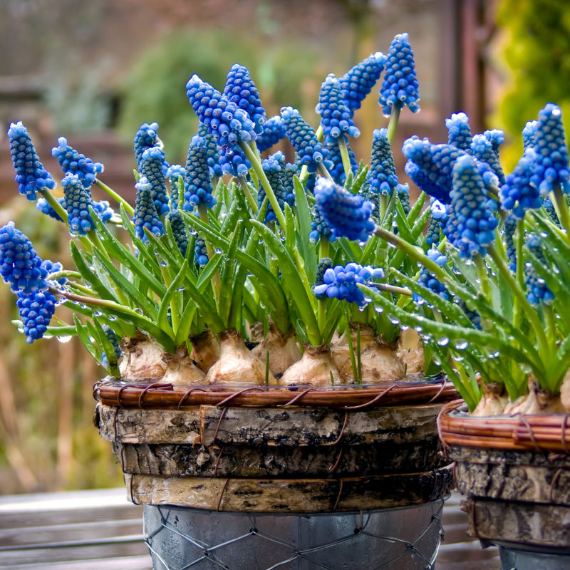 Grape-hyacinth bulbs need 8-12 weeks’ chill time; plant as you would crocus, and expect faintly fragrant blooms in blue, purple, or white two or three weeks later.