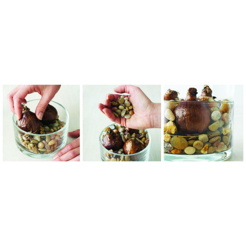 These bulbs must be chilled. They can be forced, one bulb per jar or vase, in water alone without any soil; there are special forcing jars and vases for crocus and hyacinths, but a wide container with gravel (and dense planting) will also yield lovely results.