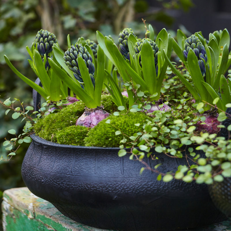 5. Remove the rest of the plants from their nursery pots, rough up the rootballs, and plant them over the bulbs according to your plan. Fill the spaces between plants with potting soil; tuck in tiny grape hyacinth bulbs.