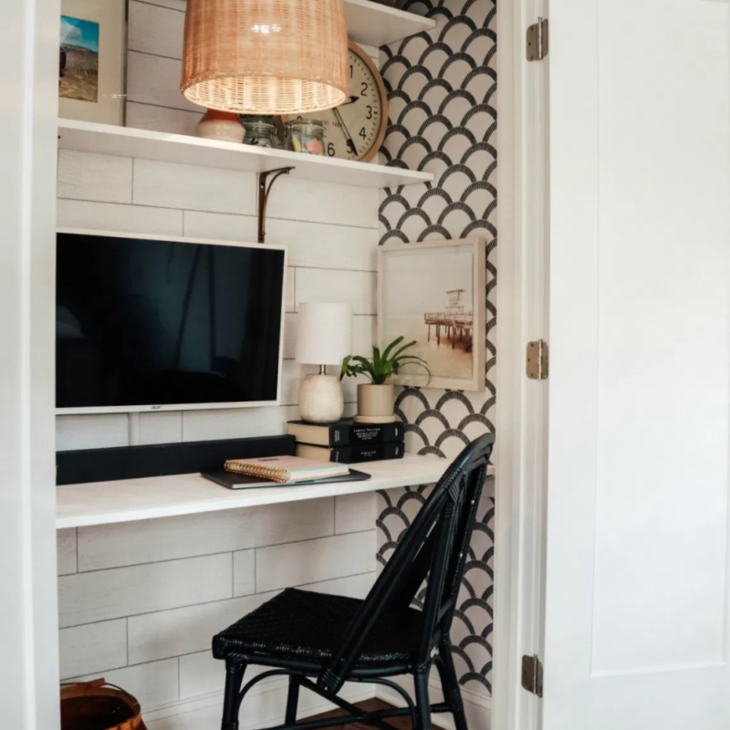 The last (and our favorite) step is to personalize your space. Do you have the right lighting? Is there a wallpaper you’ve always wanted to test in your home? This is your chance to add all the extras that will make your cloffice feel uniquely you.