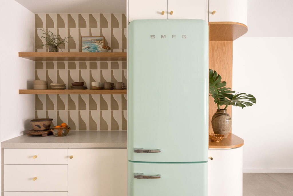 Interestingly, that’s not the only kitchen in the home—there are two! The downstairs kitchen was designed to be more casual. “We chose a fun, warm yellow backsplash tile with a wavy print to resemble the natural waves on the sunny lake,” says Lizzie. “We incorporated a minty SMEG fridge, because that felt appropriate in keeping with the ‘70s spirit of the home!”
