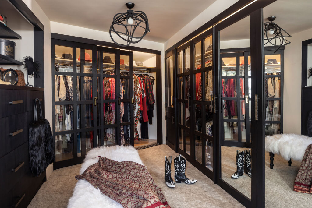 Paula’s closet is a total dream—it was made to feel like a high-end boutique where she could see everything and didn’t have to dig around. “I wanted to keep the palette pretty clean, to let her wardrobe, accessories, and hat collection be the stars, so we chose black and white, with gorgeous textured brass hardware reminiscent of her Brutalist jewelry collection,” Kress explains. “We made sure to include open shelving for her hats and bits and bobs, so she could grab them easily and play, but everything else stayed behind glass doors. The black foam ceiling light is a homage to the sculptural hats she is known for sporting to pretty much any occasion.”