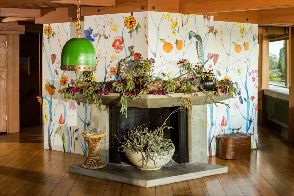 And what was a design restriction in the living room actually turned out to be a stunning statement piece. “The entire middle of the living room houses all the workings of the house including the fireplace,” Kress says. “We originally thought we could rework that area and move a lot of those inner workings, but the cost was prohibitive, so we left it and made it a focal point instead—adding the very fun and vibrant wallpaper by Voutsa.”