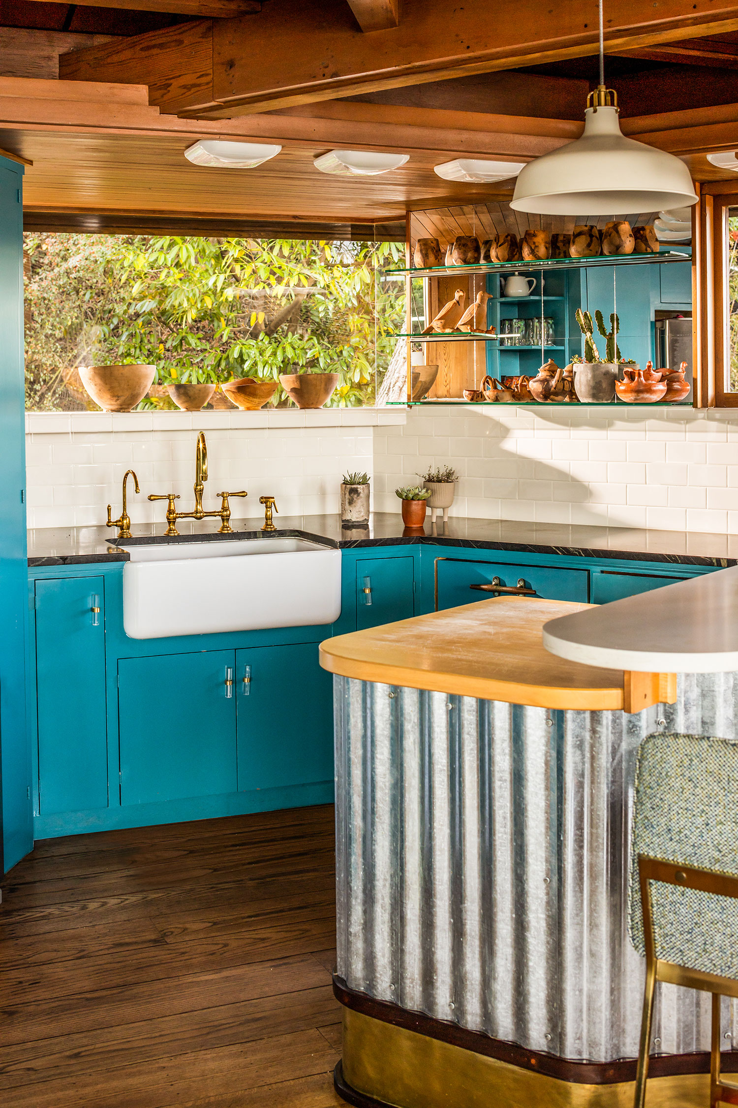 The common areas of the home also have the same relaxed, cool, and stylish feel. The kitchen has a custom island designed by craftsman John Hull that adds a bit of glam to the space with its corrugated metal based. The existing cabinets were painted a bright blue and lucite hardware was installed for more glamour.