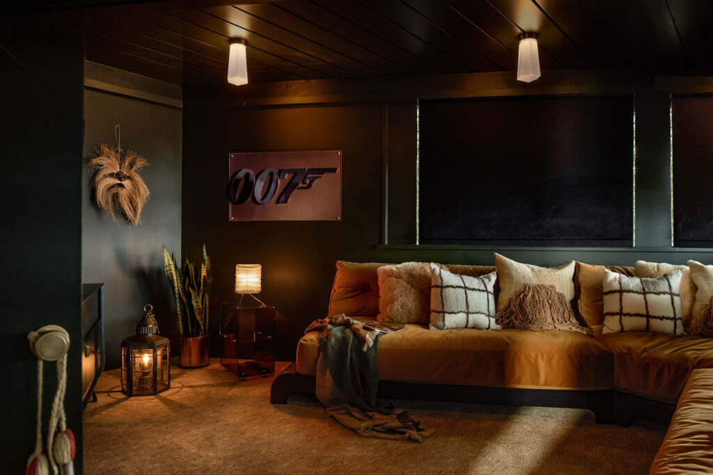 The media room is painted a dark and moody rich green to add some edge and color. It was important to add plenty of seating in the media room, but the sectional had to be built-in because of the crazy angles in the space.