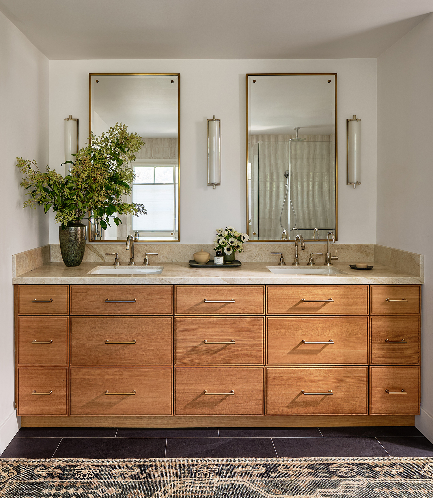 Upstairs, there are three new bathrooms, which includes the one in the primary suite. “We removed a dated Jacuzzi tub with its oversized surround and introduced a sculptural freestanding tub to achieve an airier, more elevated feel,” Madeleine says. “A wall-to-wall custom white oak vanity and an entirely new closet were crafted within the existing footprint, maximizing every inch. By reorienting the bed, we unlocked previously wasted square footage.”