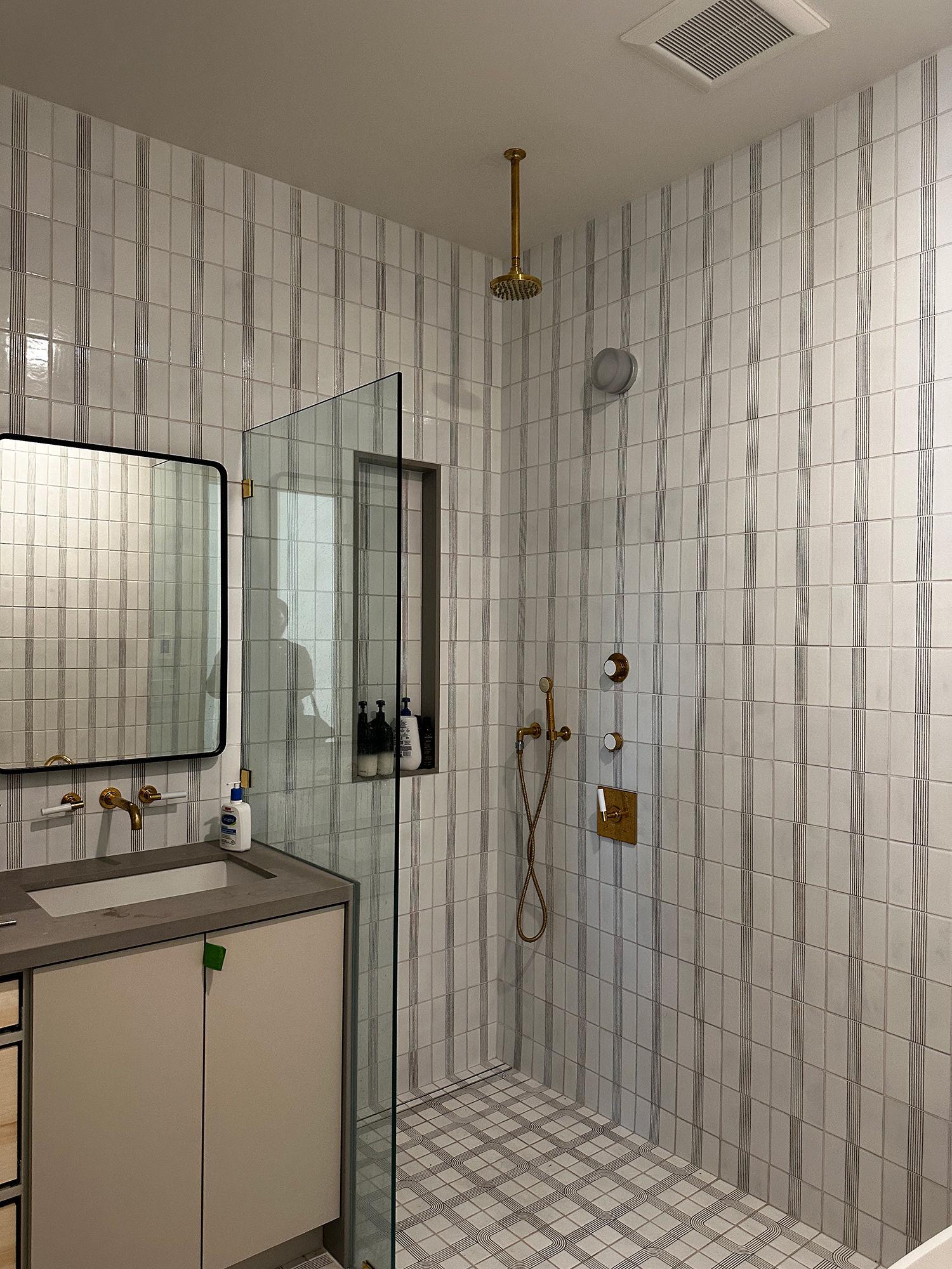 “I am enjoying the exercise of making it my own by using less dramatic colorways,” Myers says. “I also like playing with three to four color combinations in the checkered pattern, not only two.” For an extra dose of visual intrigue, she also likes to extend her pattern beyond the shower or abruptly switching to a solid field tile.