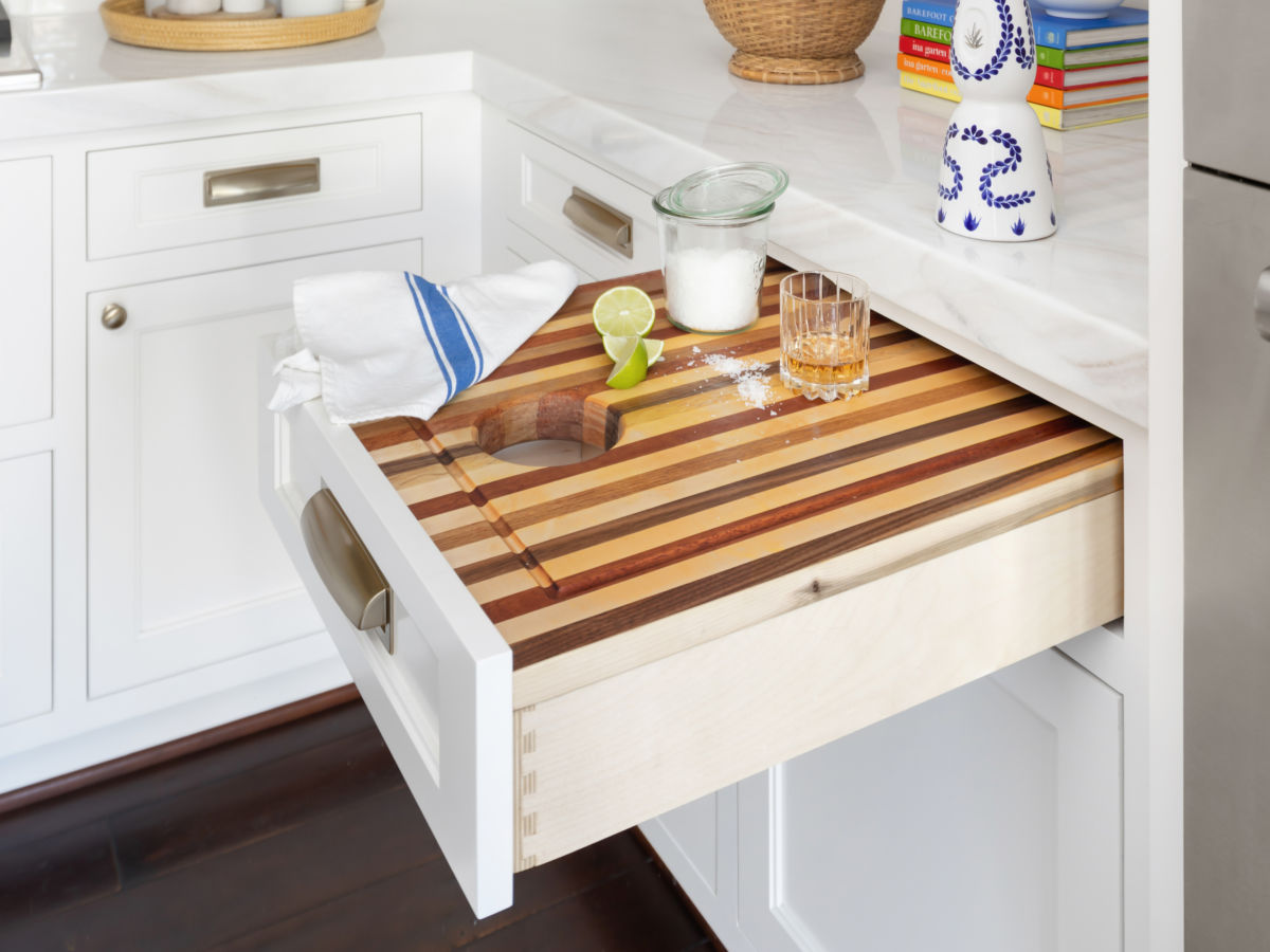 Clever built-ins can turn a kitchen into a hyper-functional work space, where a cutting board with a hole to scrape scraps into the garbage can disappear into a drawer.