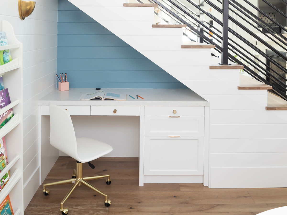 A desk in place under a stairwell, in an area that may have been dry-walled off and empty, is a savvy use of space.