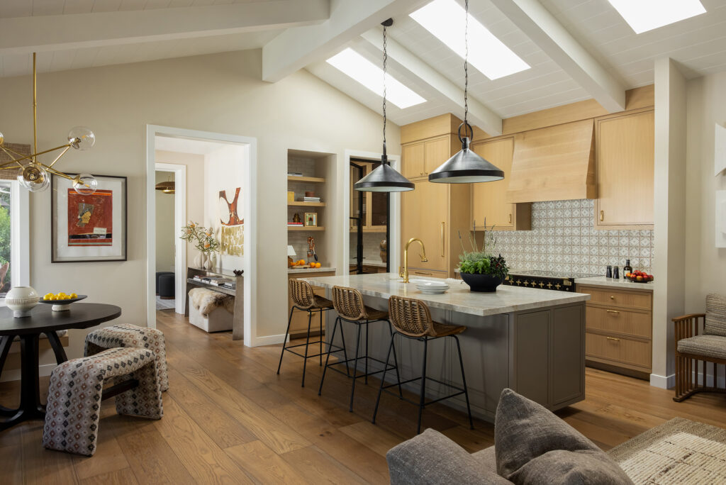 The kitchen, dining, pantry, bar, and family room have an open flow. The pitched ceiling features multiple skylights that lets the daylight stream, and the living area leads to a tree-covered patio. Throughout the home, Victoria and team made smart, functional decisions to make downsizing easier.