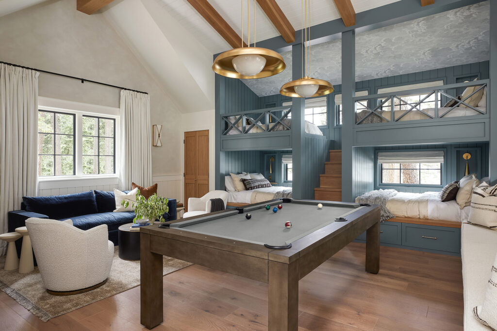 “A notable accomplishment emerged with the introduction of shed dormers, purposefully crafted to house the built-in bunks, elevating both functionality and the exterior aesthetic, in part thanks to the large-scale bunk windows designed to sneak a peek of the lake,” Adrian says. “We opted to extend the exterior gable roof—essential for visual continuity—through the interior to create a vaulted ceiling. Spatial zoning played a pivotal role as we worked to delineate spaces for a bathroom, bar, game area, and living quarters. Collaborating with a building designer and an engineer, we translated these schematics into comprehensive construction plans.”