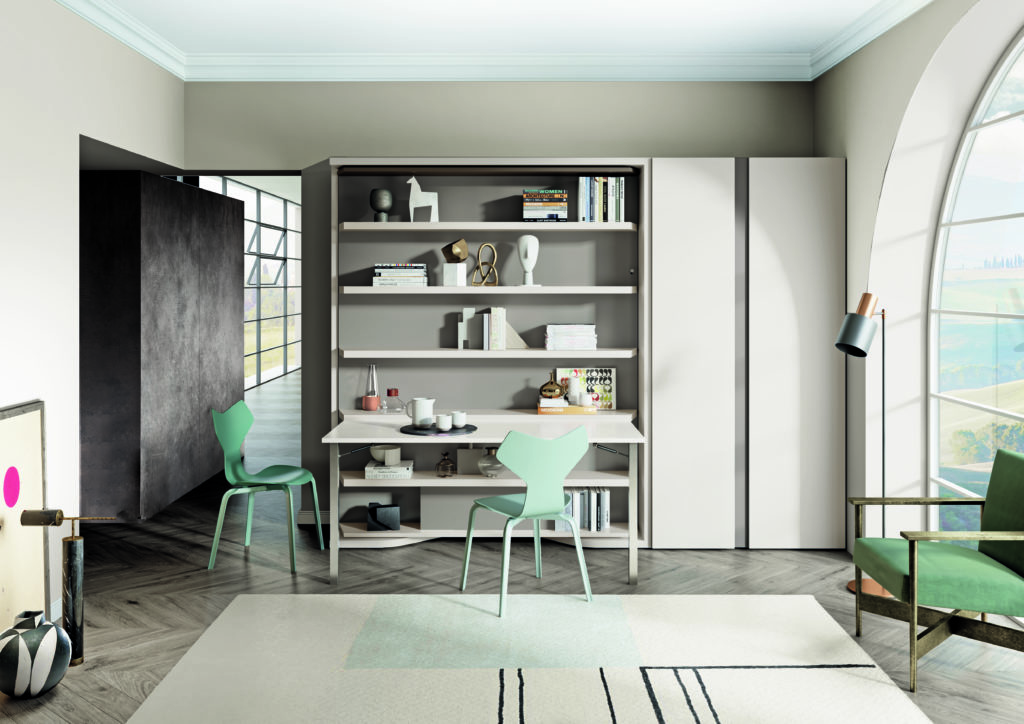 A few of the Italian-designed wall beds from Resource Furniture have a mechanism that allow them to be rotated. On one side, there’s everything one might need for a home office—including an optional pull down desk. Flip it around to reveal a wall bed. Models with a collapsible dining table are available as well.