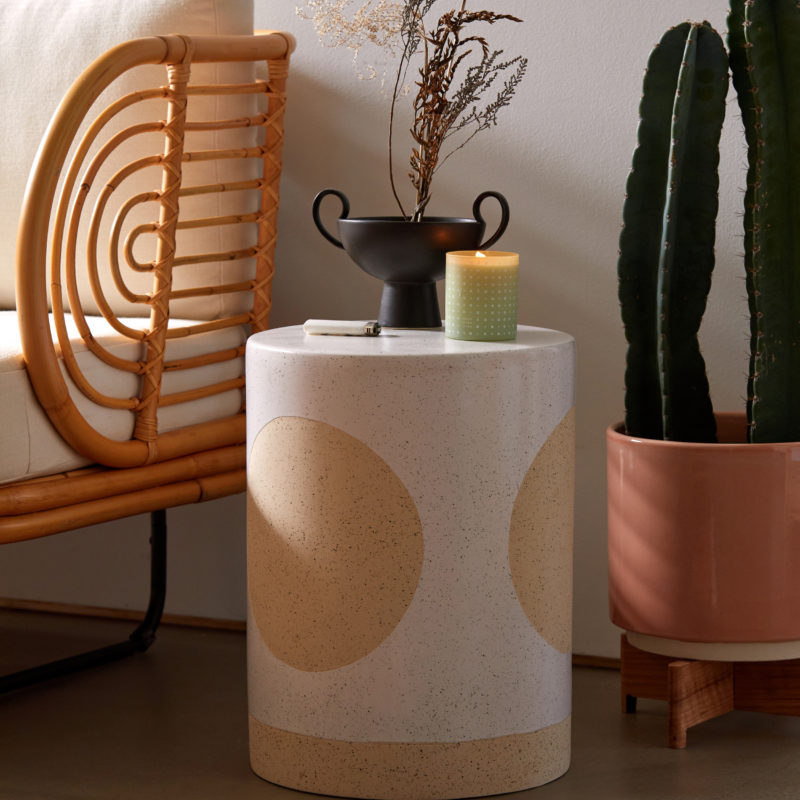 At first glance, this side table looks like a giant, minimalist candle—and we love that. What is in fact a ceramic piece is part of the Mikko collection, offering a fresh companion to the rest of the rattan pieces. $129