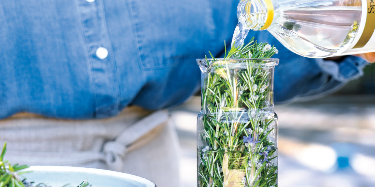Pack the herbs into an airtight mason jar. Pour distilled white vinegar into the jar until it is close to the top. Secure the lid tightly and place jar in a cool, dark place for 5 to 7 days. Give it a good shake daily.