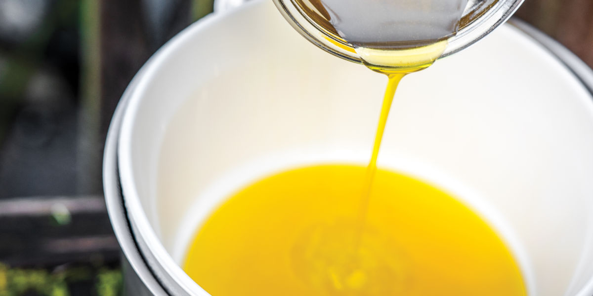 Pour 1 cup of infused lemon oil into the top pot of a double boiler. Heat water in the bottom pot to a gentle simmer. Add 1 oz. of chopped beeswax. (If you’re making more, add 1 oz. beeswax for every cup of lemon oil. More beeswax will create a harder polish.) Stir occasionally until fully dissolved. Carefully pour hot polish into tins. Let cool completely.