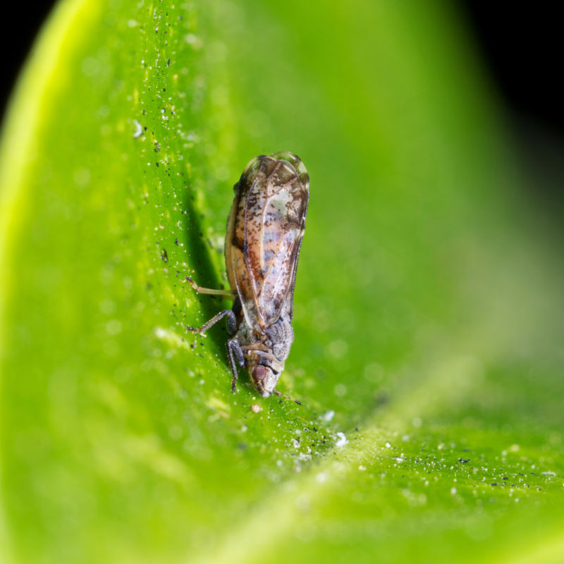HLB affects all major parts of the tree, yellowing and killing the leaves, decaying the roots, stunting fruit growth, and greening fruit bottoms. Fruit falls easily off the tree, and the juice is bitter and unusable. The disease can kill a citrus tree in as little as five years, and there is no known cure. Worst of all, it spreads rapidly depending on how quickly psyllids multiply and travel from tree to tree. Up to 12,000 psyllids can accumulate on a single tree during a 60-day flush period. Imagine 12,000 psyllids flying off in every direction possible from one infected tree in a citrus grove. Since psyllids can mature in just a few weeks and fly away, entire groves can become infected with up to 12,000 psyllids per tree in less than 1 year. All of this can happen before most of the trees show any symptoms.