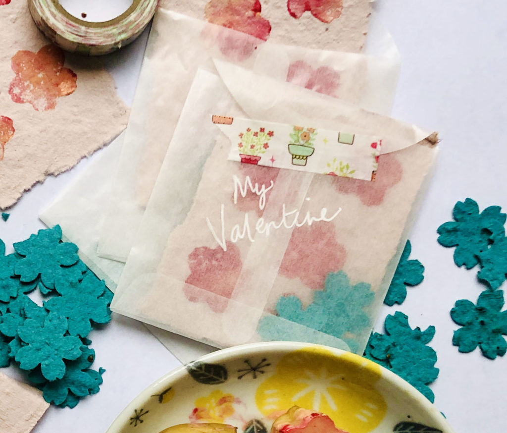 After the paint has dried, write a little message on the back, slide the cards into the semi-transparent glassine paper envelopes with a good pinch of flower-paper confetti, and then seal them shut with a little strip of decorative washi tape or a sticker. Write the recipient’s name on the front of the envelope with the opaque gel pen, and hand-deliver.