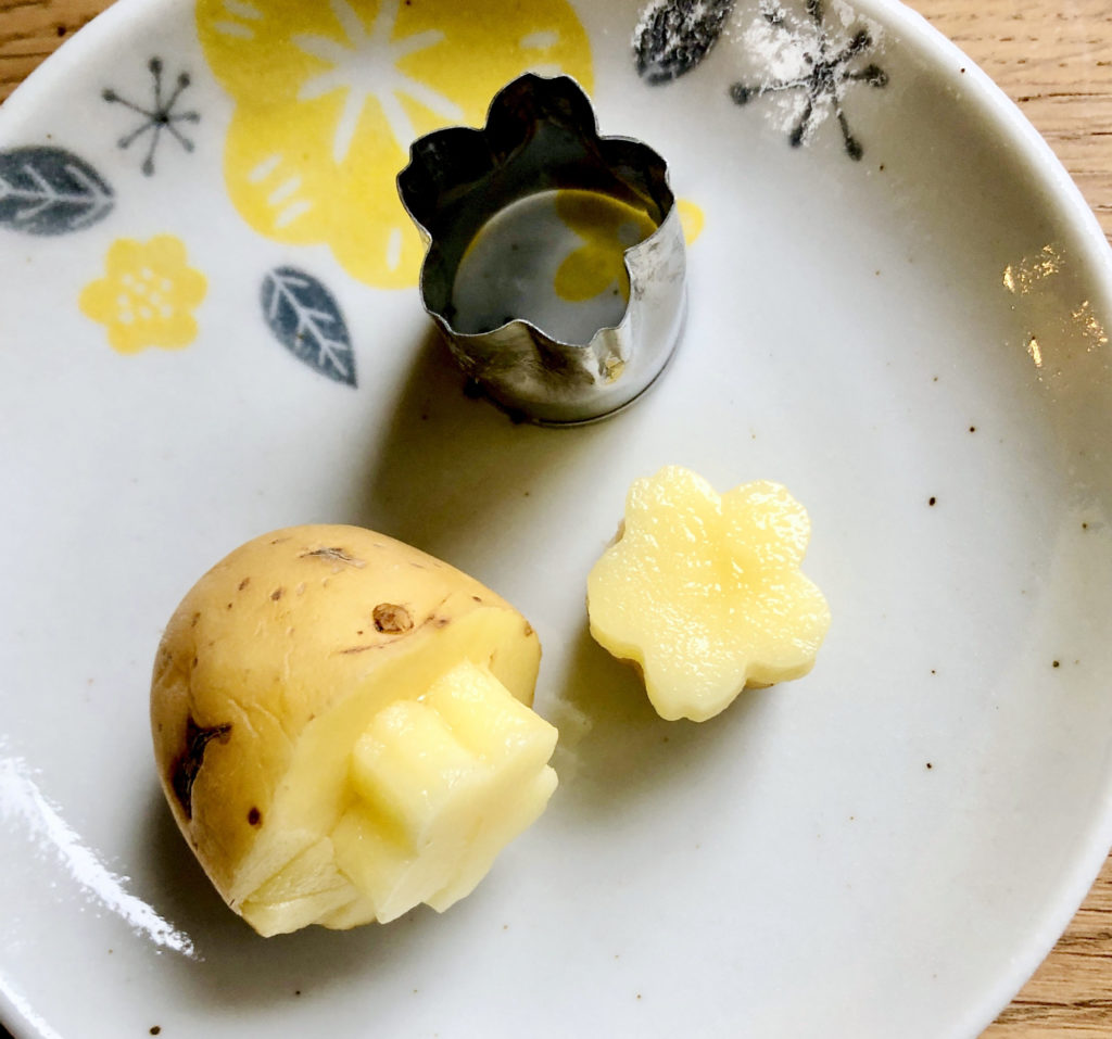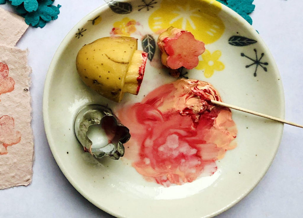 If you already have a cute stamp you’d like to use, more power to you! But for the cheapskates crafty folk among us, there’s no better stamp than a potato. If you have good knife skills, you can carve the stamp yourself, or you can use a vegetable stamp (like they use in Japan for making cute bento and such). Cut a small potato in half, then firmly press the stamp into the cut side, going down about 1/4″. Then take a paring knife and carefully trim away the outside edge of the potato so that the stamped portion sticks out.