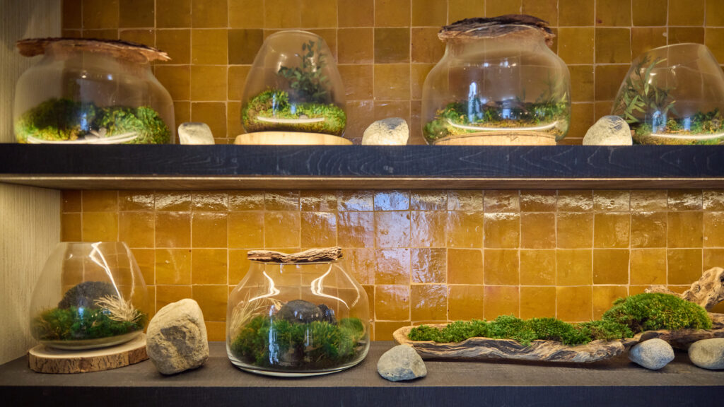 RC Inc. put together unique atriums using preserved moss, stone, and wood, bringing pieces of nature indoors that require very little maintenance. The salvaged wood pieces are also covered in moss, which is not only pretty to look at, but can also rid the air of toxic volatile organic components, also known as VOCs.