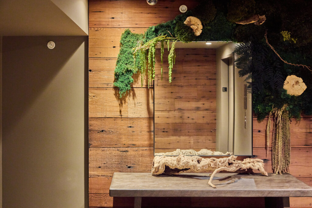 Another quirky element at the 1 Hotel are the mirrors located in the elevator area, a space that is notorious for not having great lighting. To add life to this typically drab space, they added draping dried ferns, moss, and dried chanterelle mushrooms. This could work really well in an entryway space, or even the right bathroom scenario. Looking for some inspiration on drying ferns and flowers? Check out our story on Full Belly Farm here.