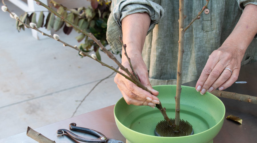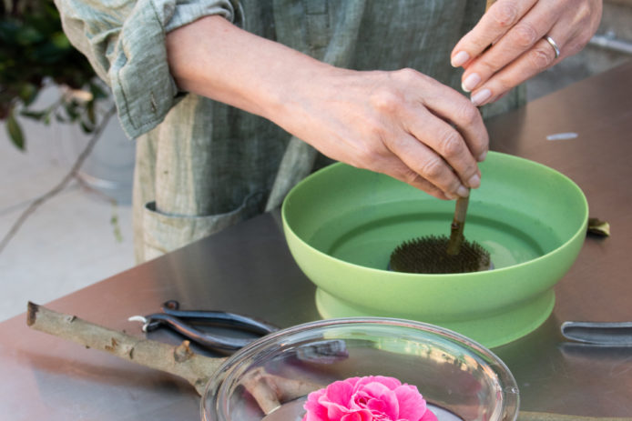 A spiked flower “frog” strong and heavy enough to support the stems is essential. So are a pair of clippers and a shallow vessel that’s just deep enough hold water but not so high that it blocks the arrangement. A pitcher of water and a bowl, for submerging and clipping stems, helps too.