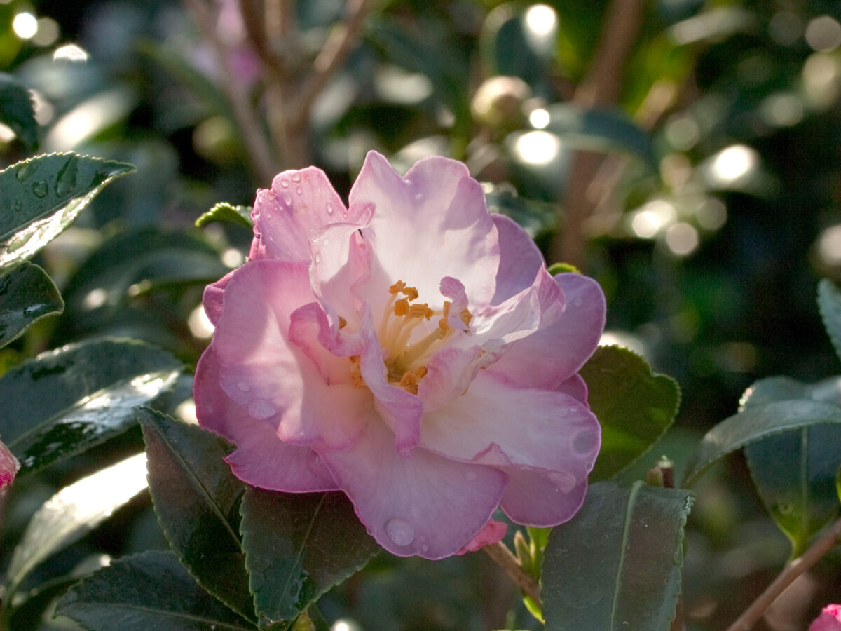 Plant Inspiration: It’s a Breeze® Ivory Blush Groundcover Rose, October Magic® Dawn™ Camellia, Pink Perplexion™ Camellia, Blush Pink™ Nandina, Suntastic™ Pink Abelia, and Platinum Beauty® Lomandra. These varieties echo Kusumi’s soft, desaturated mood and blend beautifully with greens, silvers, and the surrounding landscape.