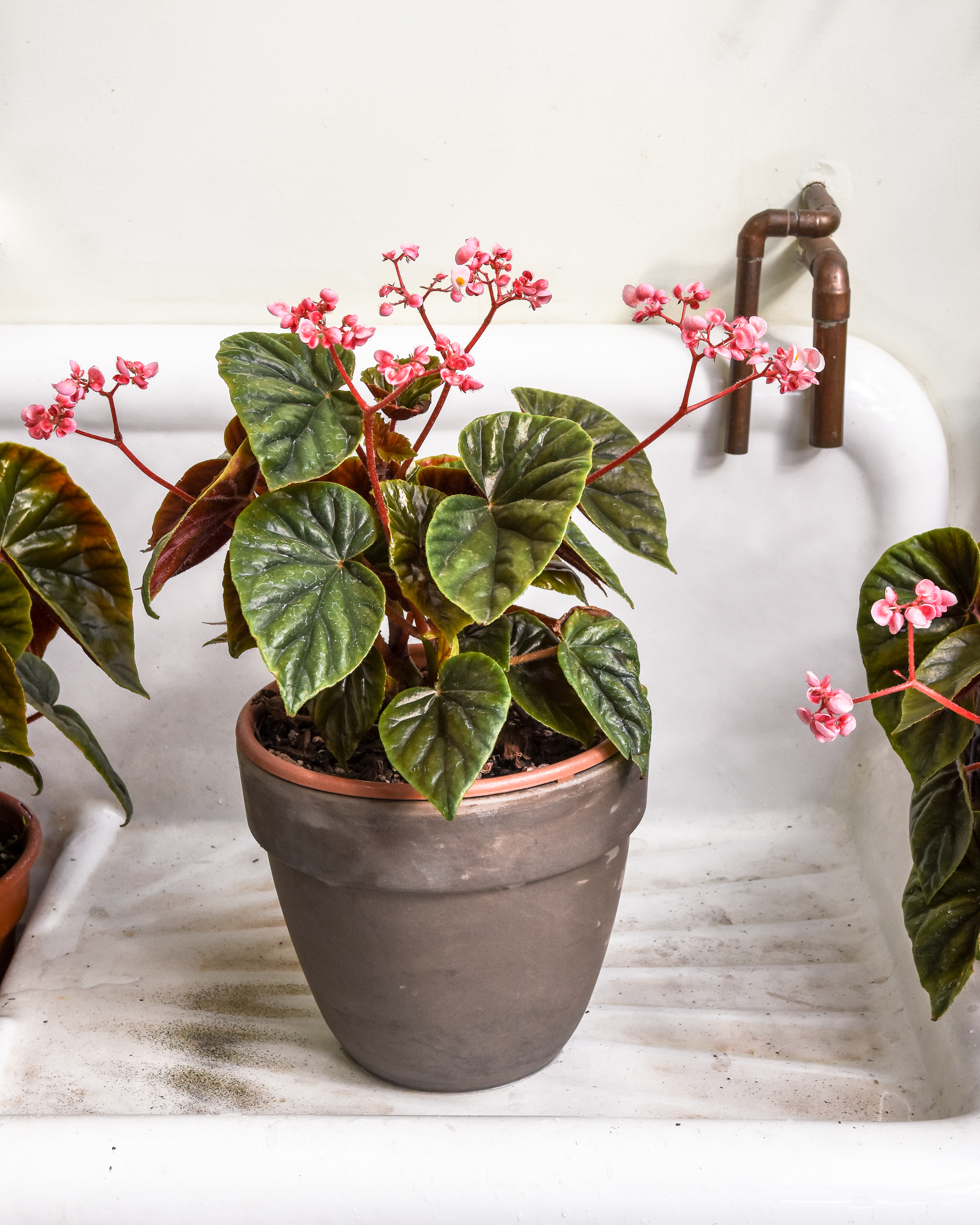 And, if there are already aerial roots, just pop the cutting into a glass of water. You can also let it dry slightly for a day and then pot it in some really moist potting soil. If it doesn’t have aerial roots, strip the lower leaves off the stem first. This works well with plants like rosemary, lavender, or any other mint-family herb. Begonias sprout easily from stem cuttings too.