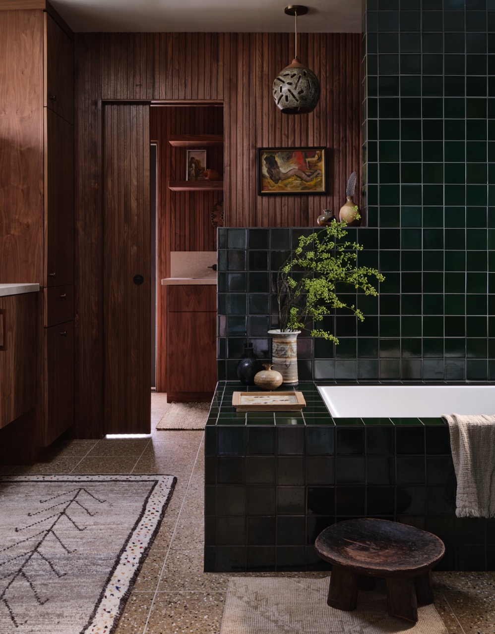 An earthy and organic 1970s-inspired bathroom design featuring rich green tile, terrazzo flooring, and warm wood walls.