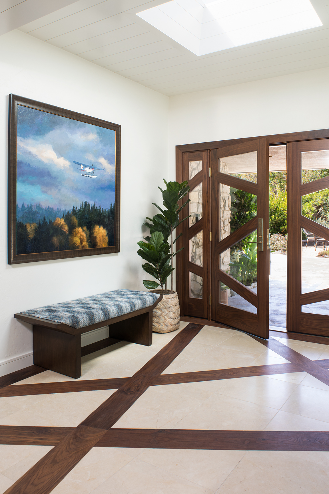 Custom California entrance. This area was lacking in character. Grice designed these doors and sidelights for the wow factor from both the exterior and interior. The floor pattern was created to extend this feature into the home. Nickel gap on the ceiling and into the skylight created even more architectural interest. A commissioned oil painting from one of the owners photographs and a custom bench complete the look.