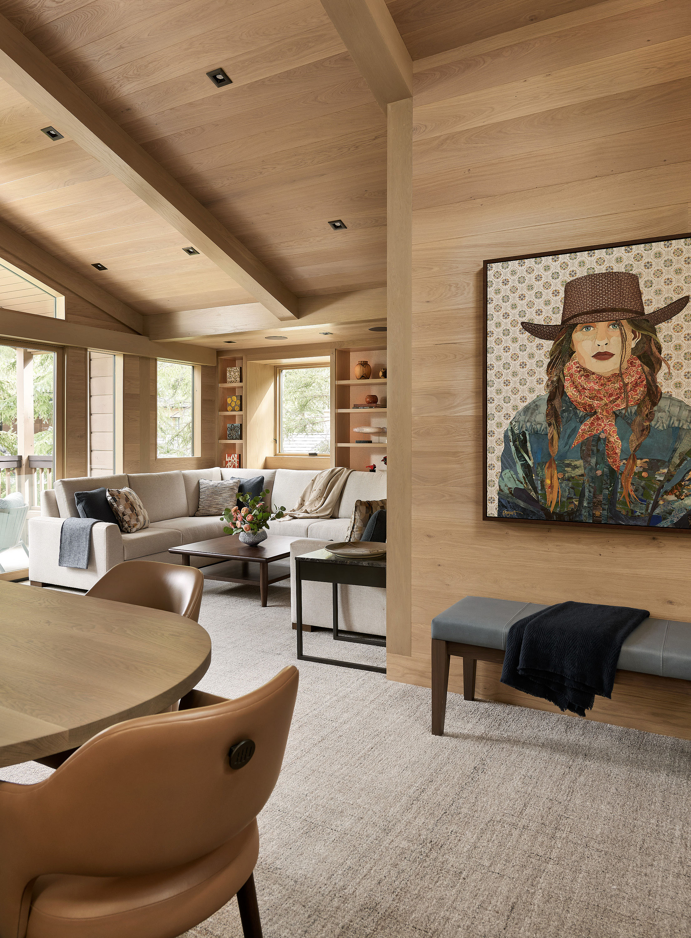 This mountain chalet was made cozy with the oak walls and ceilings. Working closely with the contractor, every detail was seamlessly executed. The cowgirl collage by Brenda Bogart gives the space a Western vibe loved by the Texas owners. The thick woven wool carpet and soft textured fabrics invite you to stay!