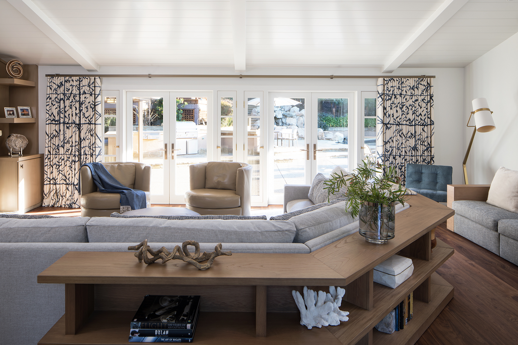 This Rancho Santa Fe Living Room has a fantastic view and access to a beautiful pool and fountain with a massive pool deck. The owners have a large local extended family and love to entertain. The huge custom sectional, 2nd row sofa and chairs allows almost unlimited seating for game day parties. A custom sofa table provides plenty of space for drinks and snacks. The view to the patio and pool is beautifully framed in a blue and white linen drapery fabric from Kravet.