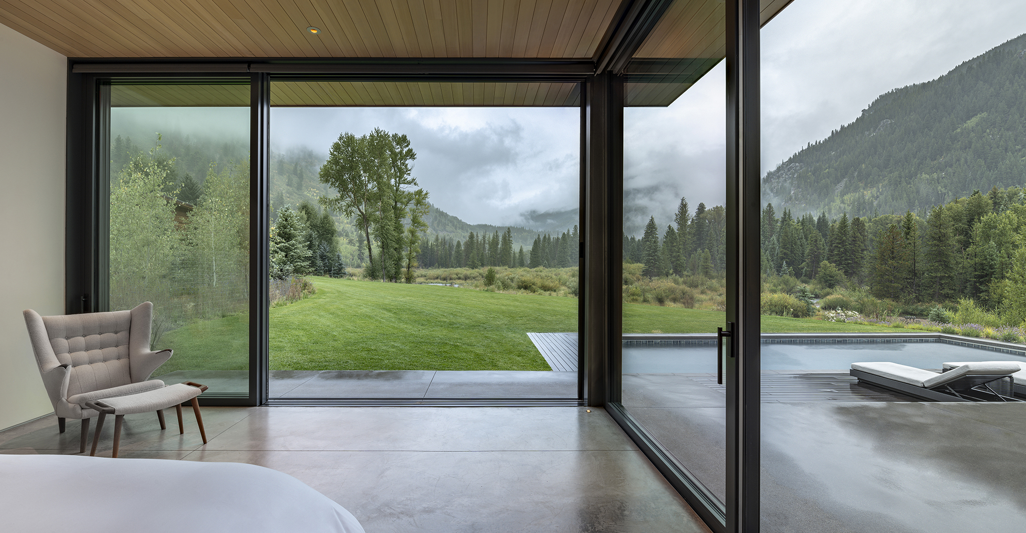 The main level primary suite of Aspen Valley Home by Turkel Design offers direct access to the pool and patio, with panoramic views of the mountains and forests beyond.
