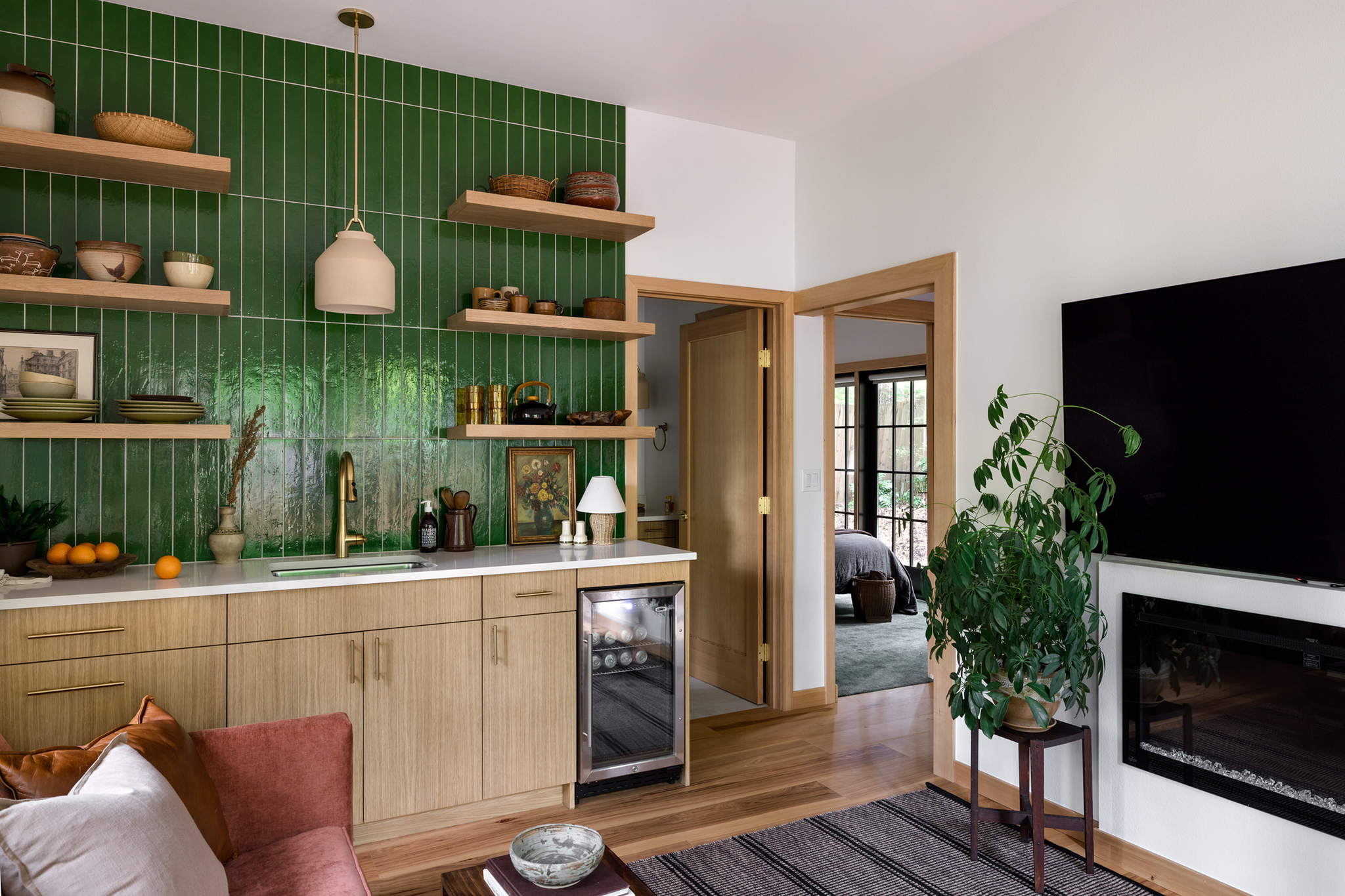 This compact kitchenette was designed for aging parents moving into an accessory dwelling on their children’s forested property. The space balances independence and connection, and is a place for morning tea, small gatherings, and memories of an active travel life reflected in the curated pottery and art. Hand-glazed green tile provides a vibrant backdrop, its organic sheen evoking the lush landscape just beyond the windows. Light oak cabinetry, brass accents, and open shelving lend warmth and accessibility, creating a space that feels both grounded and worldly; an elegant blend of function, familiarity, and the beauty of a well-lived life.