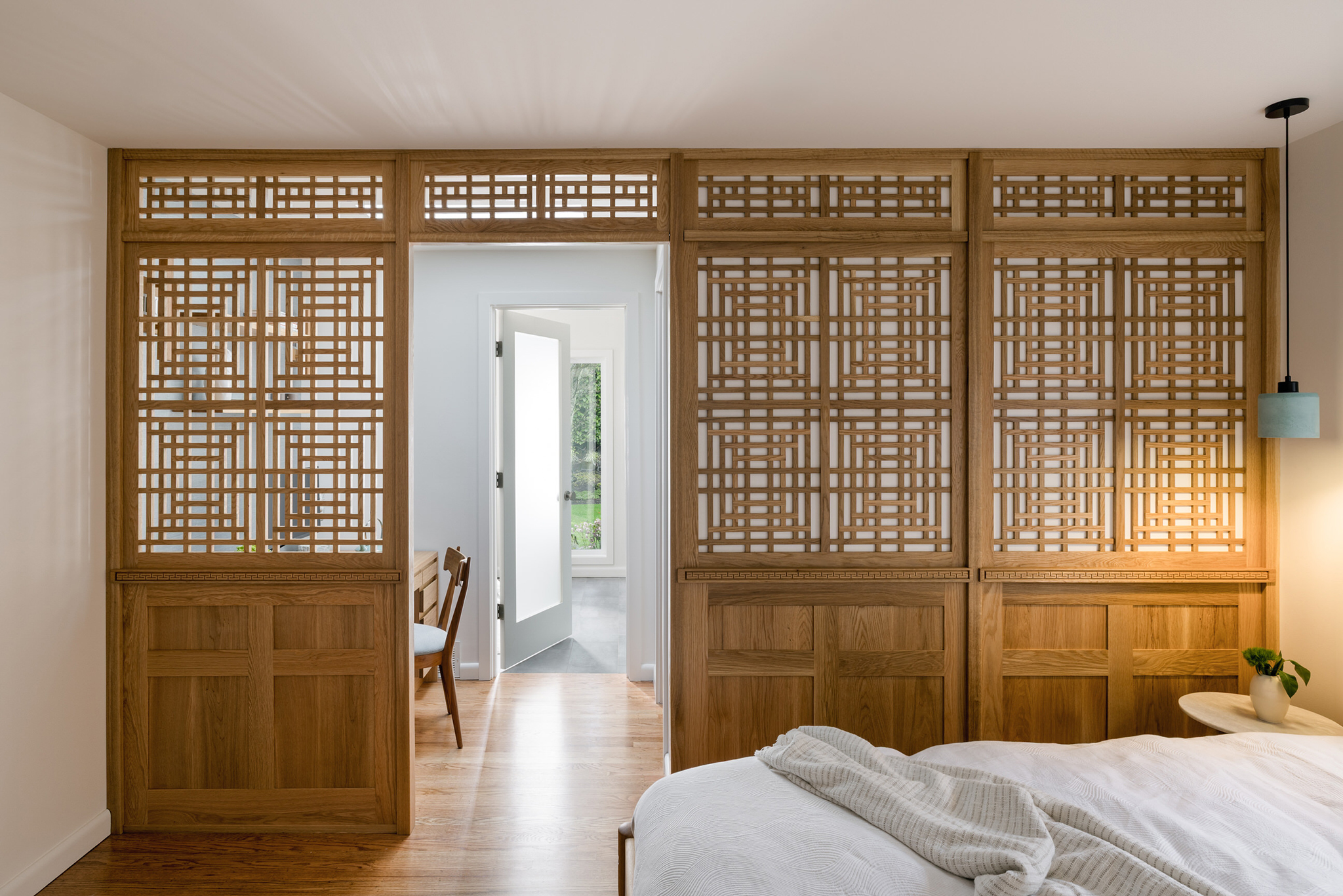 This serene primary suite transforms a modest space into a sanctuary of craftsmanship and calm. Custom oak screens, inspired by woodwork of Nepal, define the bedroom and home office with light-filtering warmth. Repeating geometric patterns offer privacy while maintaining a sense of openness, their rhythm echoing the grain of the wood floors and furniture. A built-in motorized desk tucked behind the screen becomes a tranquil workspace, softly illuminated by a skylight above. Thoughtful proportions, subtle color, and natural materials make this retreat feel timeless and crafted for both rest and reflection. Shifting light evokes memories of travel in the Himalayas.
