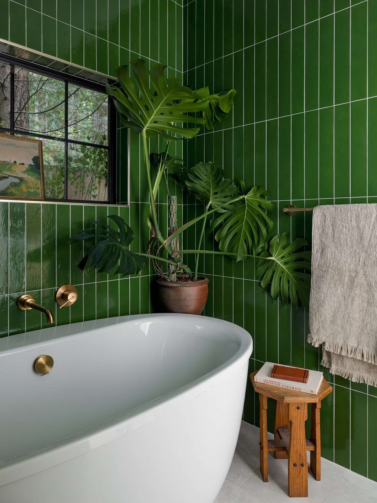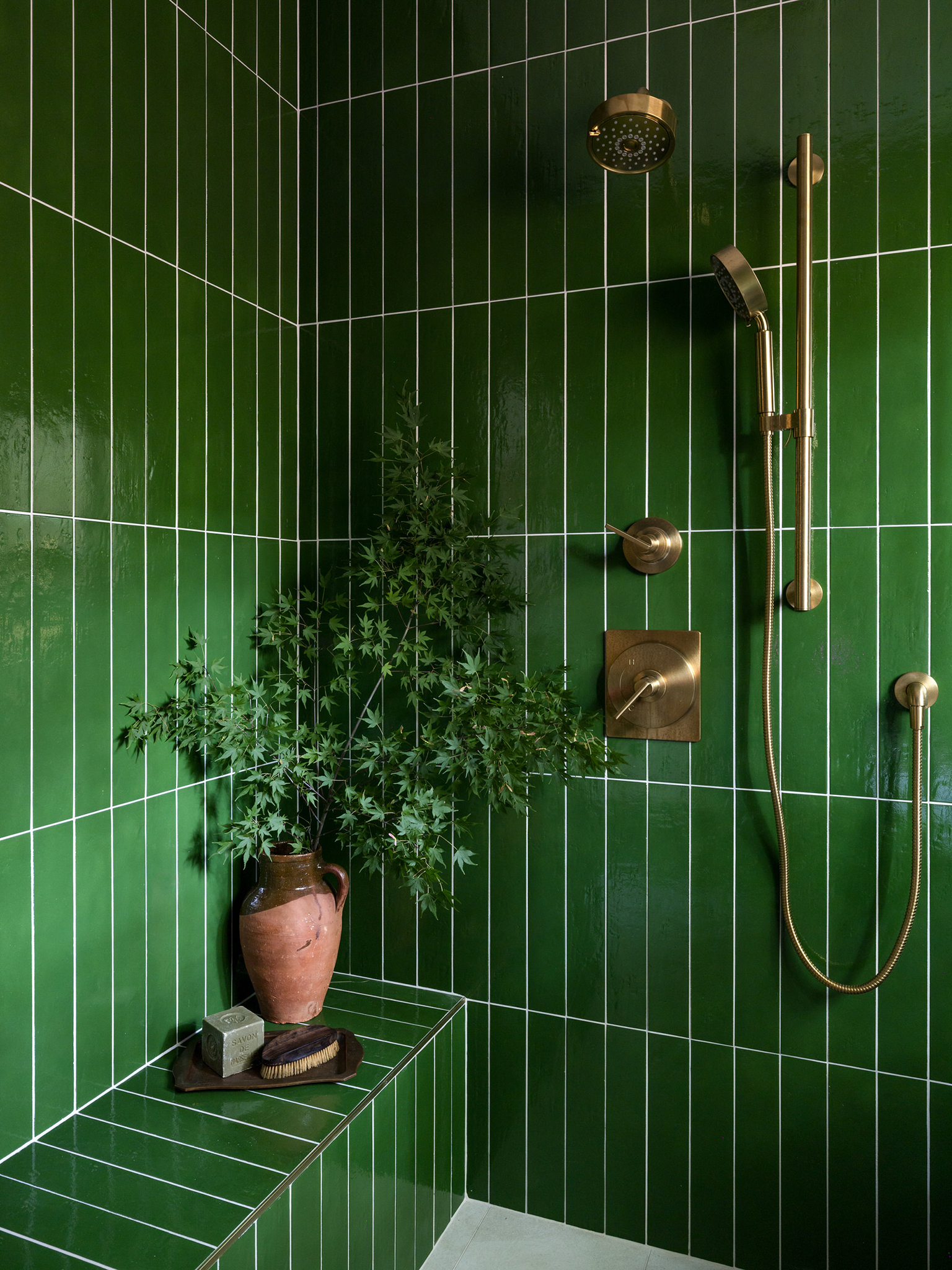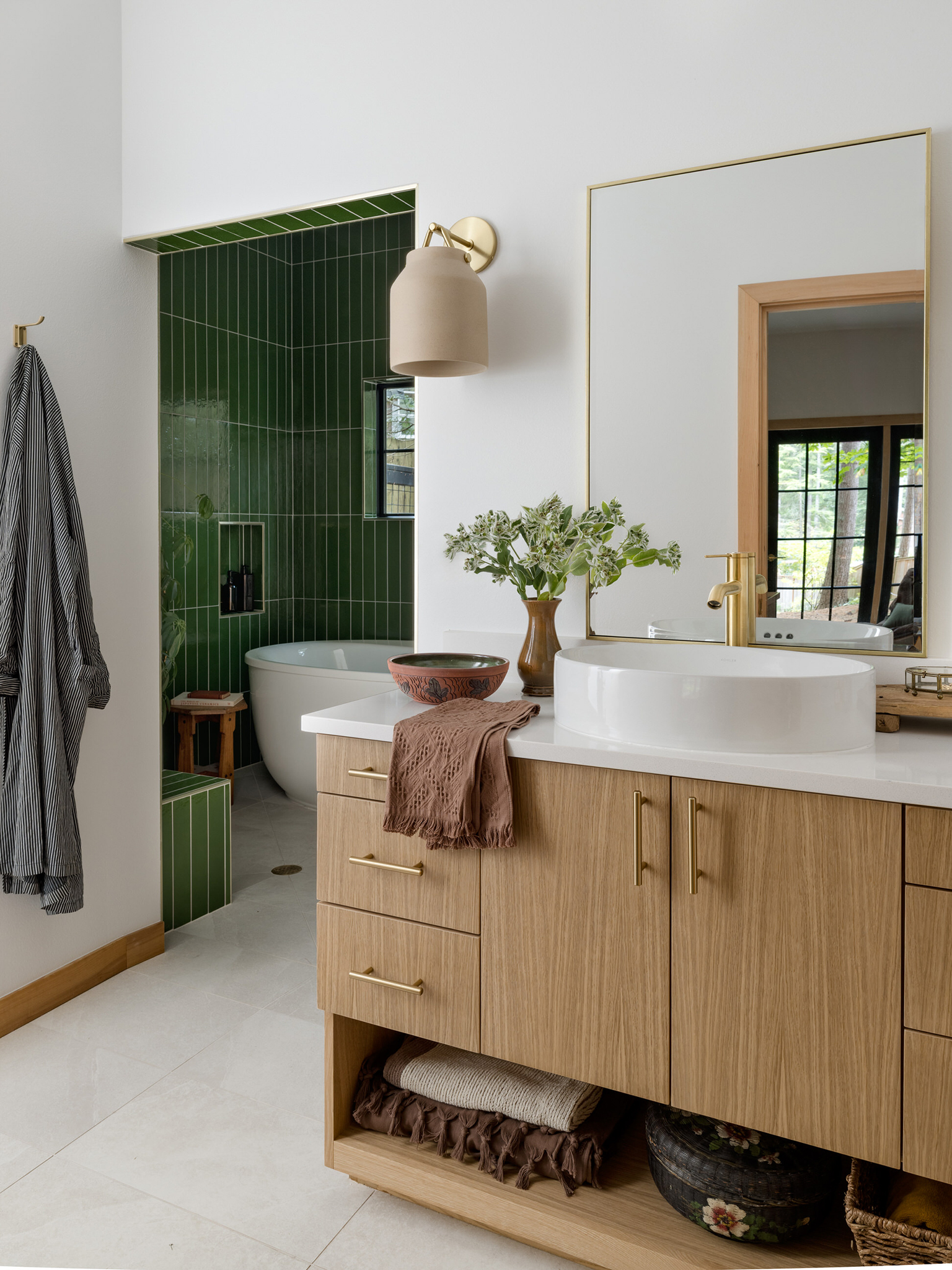 This jewel-box bath embraces nature with bold, immersive intent. Glazed forest-green tile wraps the tub and shower like a living canopy, its handmade texture catching light and deepening the room’s lush, botanical feel. Brass fixtures add gentle warmth, echoing the earthy tones of ceramics and wood accents. A freestanding tub sits beside thriving greenery and a quiet window view, creating a spa-like retreat rooted in the Pacific Northwest landscape. An integrated bench, curated objects, and soft textiles layer comfort and grounded luxury. The result is a sanctuary that feels intimate and transportive, where daily ritual meets serene, garden-inspired escape.