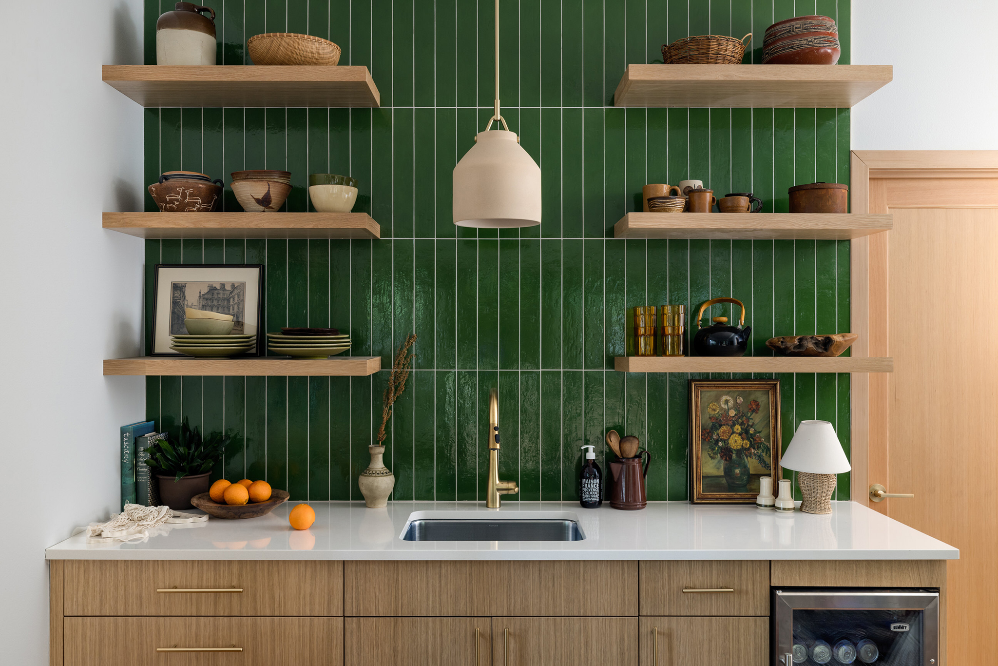 This compact kitchenette was designed for aging parents moving into an accessory dwelling on their children’s forested property. The space balances independence and connection, and is a place for morning tea, small gatherings, and memories of an active travel life reflected in the curated pottery and art. Hand-glazed green tile provides a vibrant backdrop, its organic sheen evoking the lush landscape just beyond the windows. Light oak cabinetry, brass accents, and open shelving lend warmth and accessibility, creating a space that feels both grounded and worldly; an elegant blend of function, familiarity, and the beauty of a well-lived life.