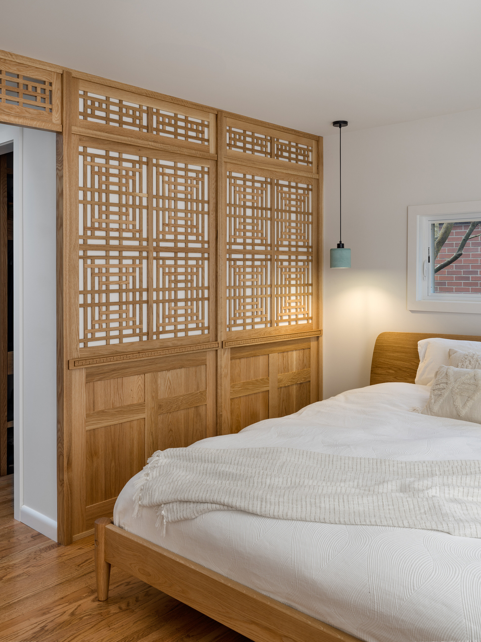 This serene primary suite transforms a modest space into a sanctuary of craftsmanship and calm. Custom oak screens, inspired by woodwork of Nepal, define the bedroom and home office with light-filtering warmth. Repeating geometric patterns offer privacy while maintaining a sense of openness, their rhythm echoing the grain of the wood floors and furniture. A built-in motorized desk tucked behind the screen becomes a tranquil workspace, softly illuminated by a skylight above. Thoughtful proportions, subtle color, and natural materials make this retreat feel timeless and crafted for both rest and reflection. Shifting light evokes memories of travel in the Himalayas.