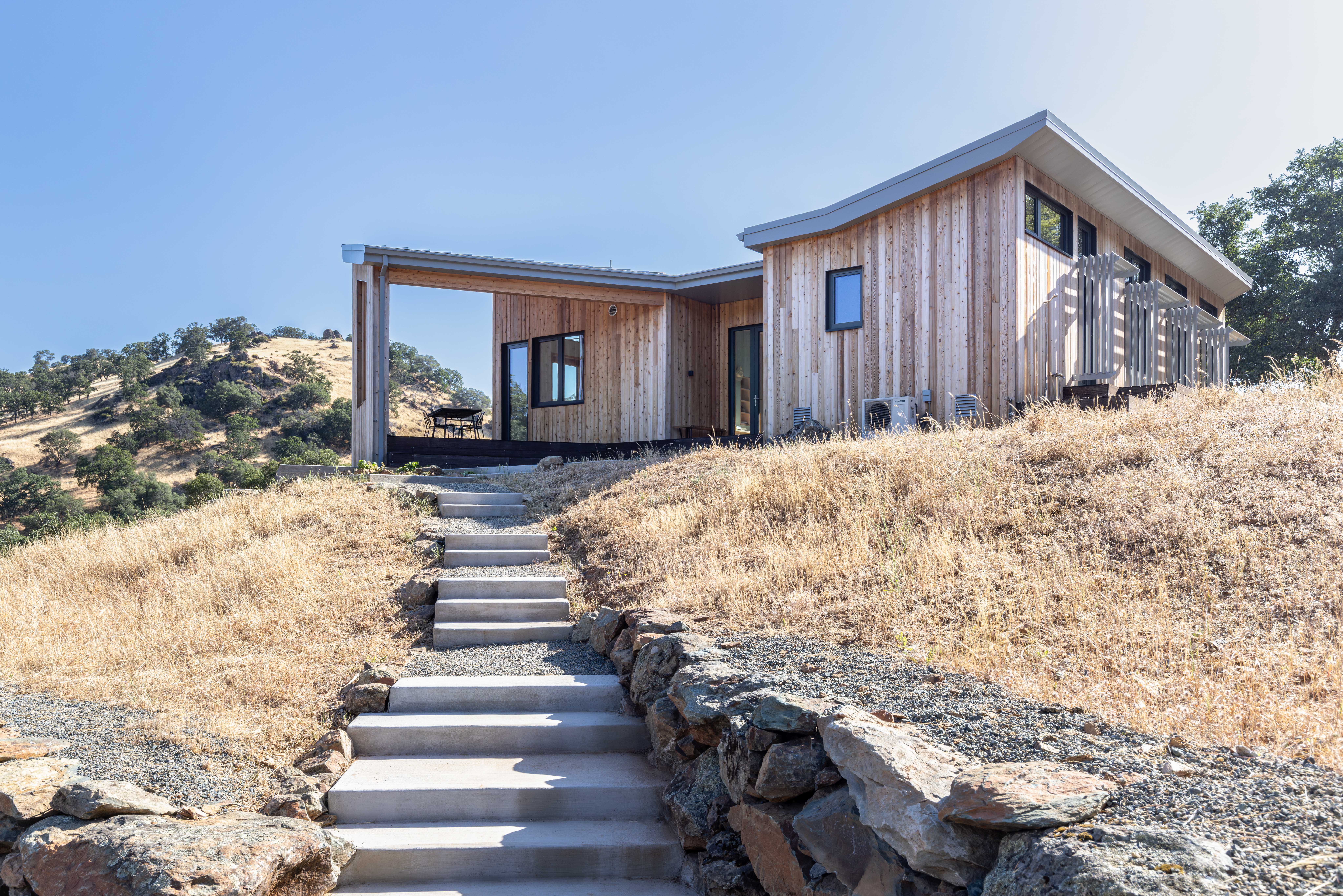 The path leads to the entry and covered outdoor dining area, which frames views of the hill beyond.