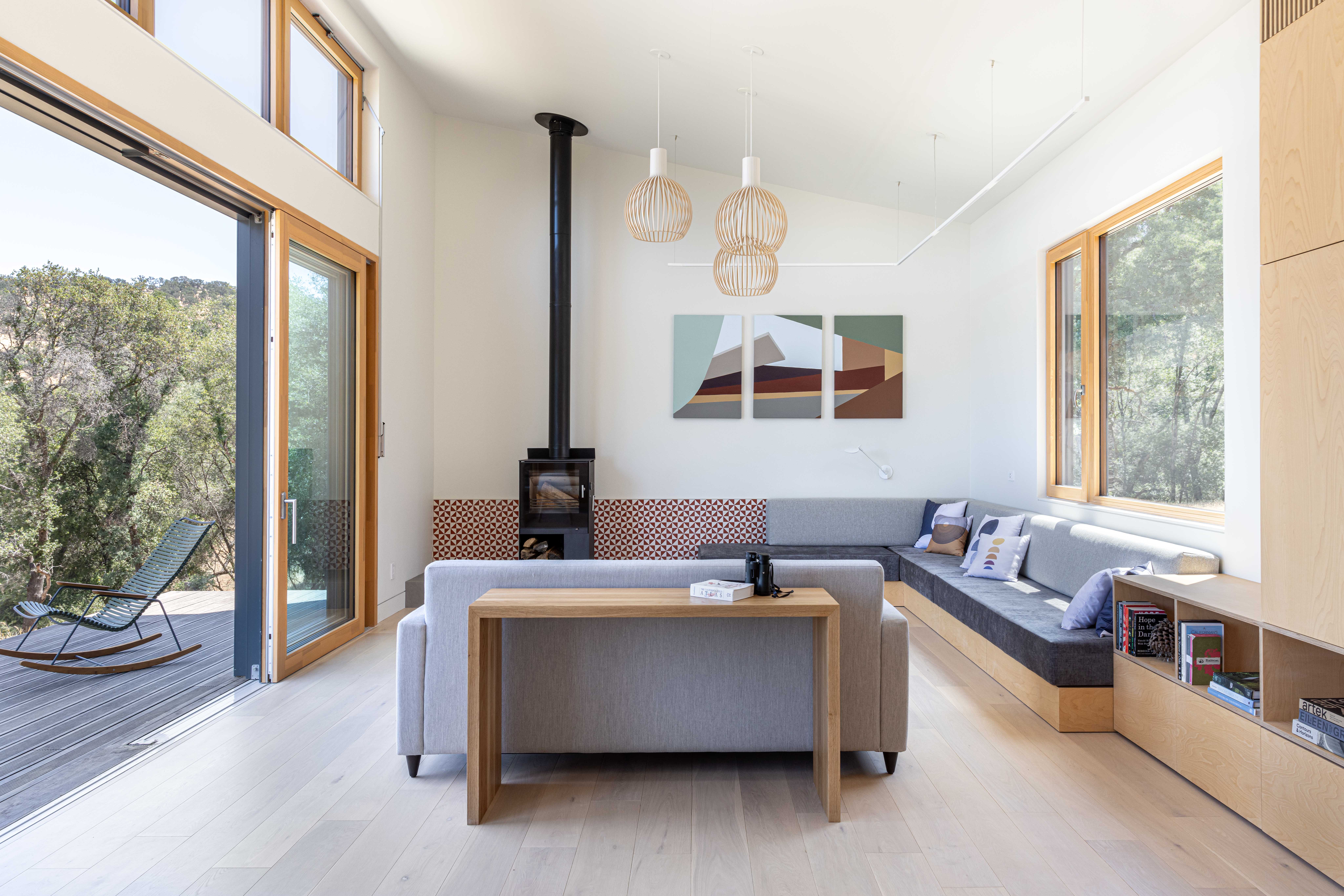 The living room features Finnish light fixtures for a Scandinavian modern feel, and includes large sliding doors to the deck for indoor outdoor living and a wood stove for heating backup in the winter.