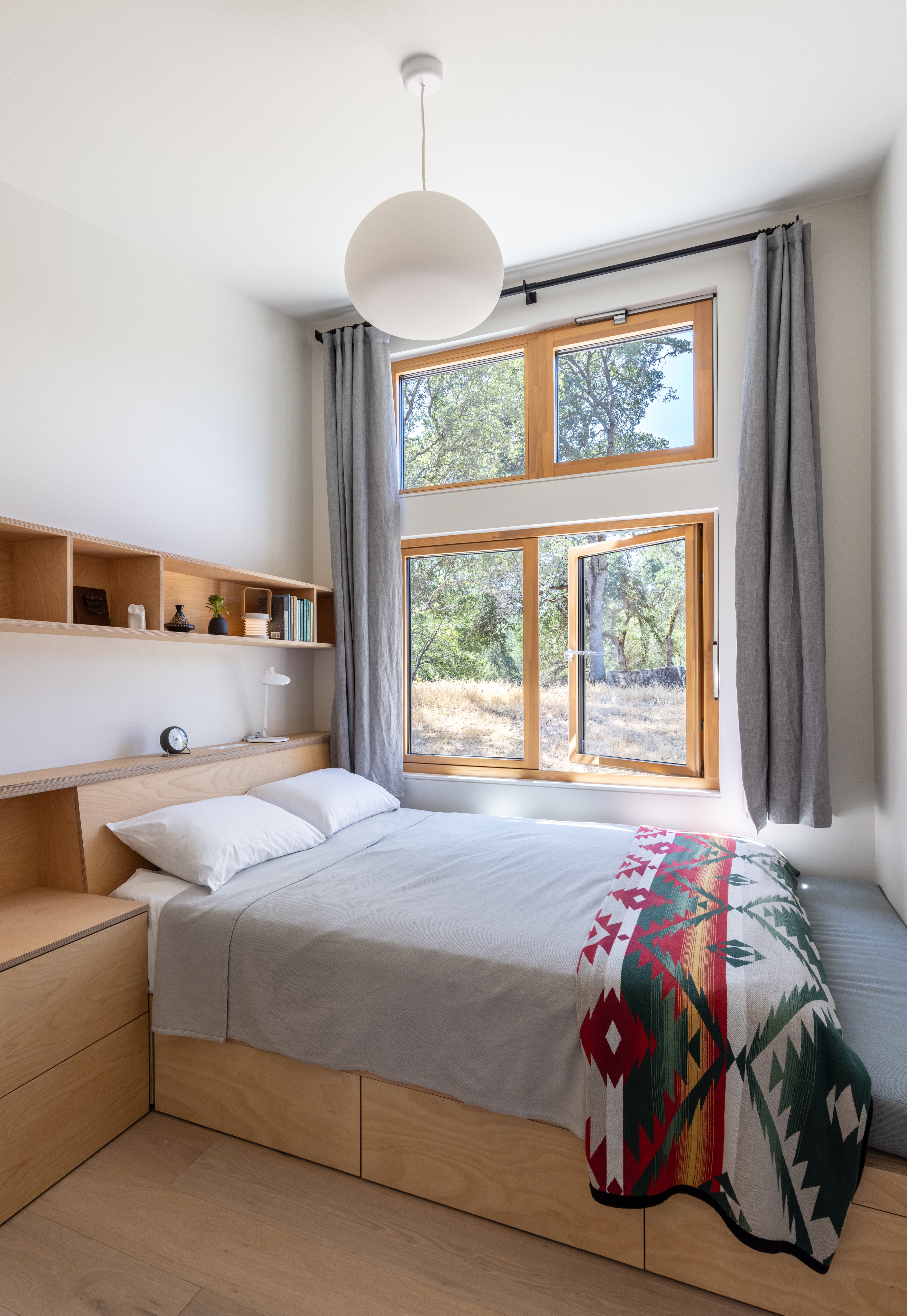 The west wing wall shelters the house from the afternoon sun, while the wood slat screening softens the space and provides light, views, & ventilation.