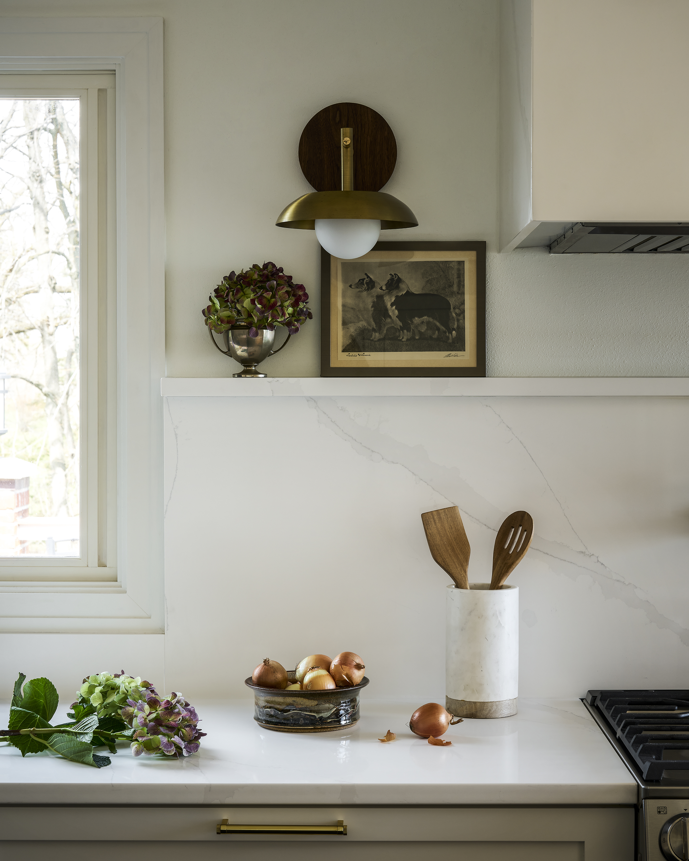 Cozy Cabin Floating Home kitchen with custom cabinetry, patterned Zak & Fox roman shade, handmade tiled backsplash, and one of a kind brass hood by Dyna Metal